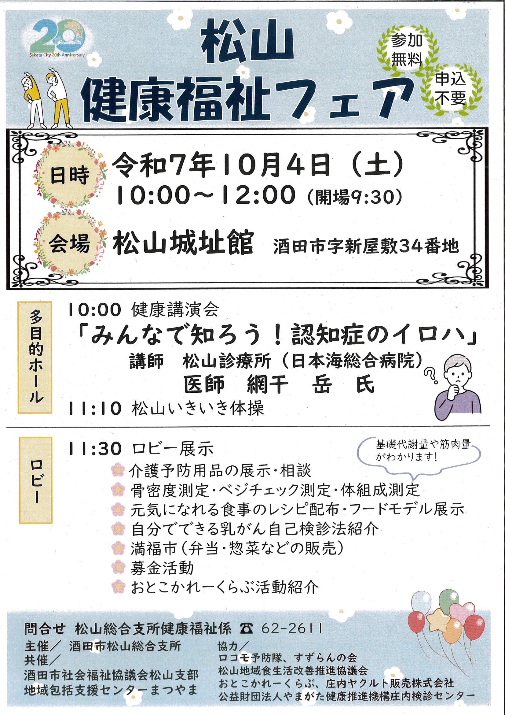 10月4日(土)10:00(開場9:30)~12:00、松山城址館にて酒田市松山総合支所主催『松山健康福祉フェア』が開催されます。
