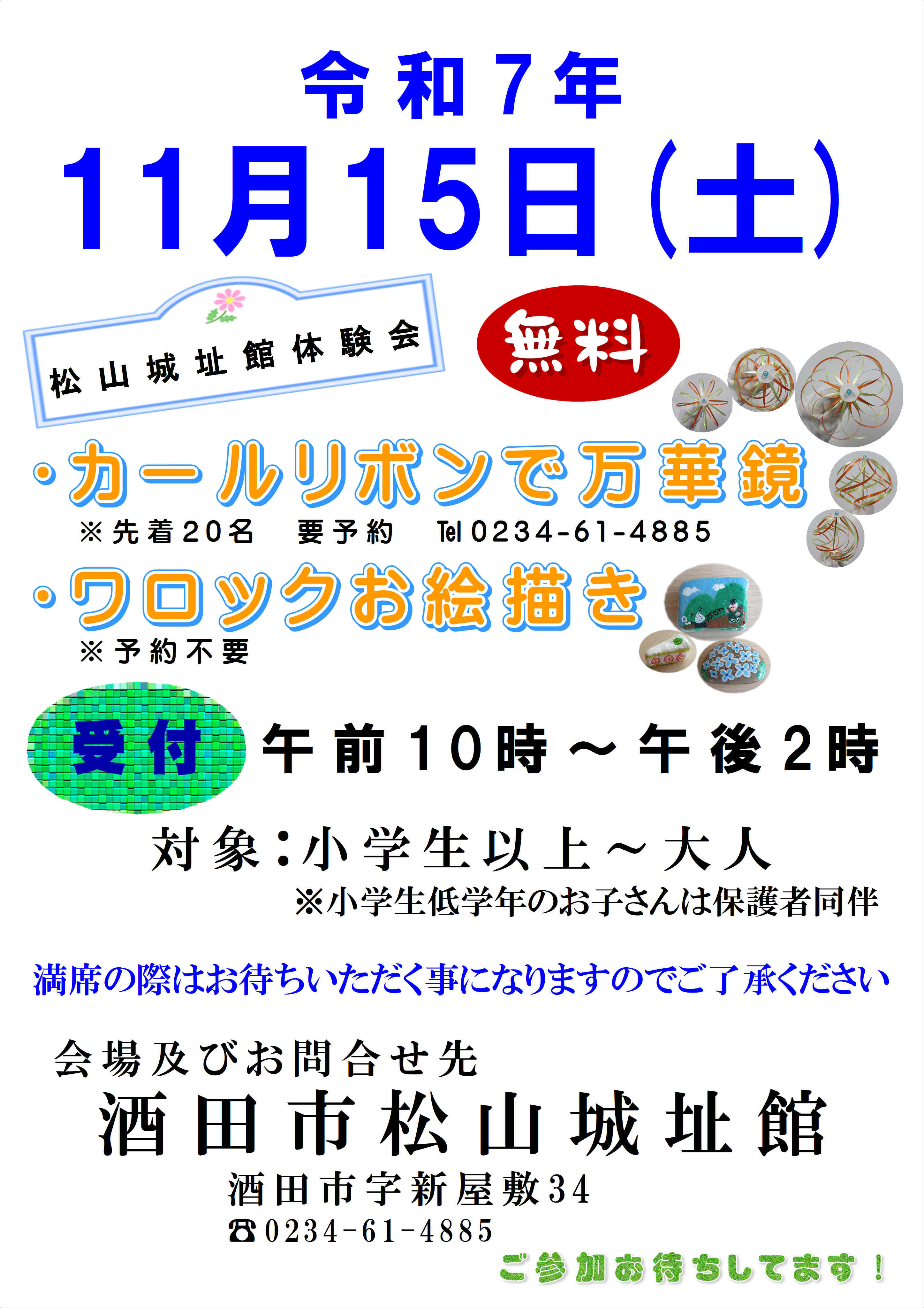 令和7年11月15日(土)、午前10時~午後2時まで松山城址館ロビーにて松山城址館体験会を開催します。