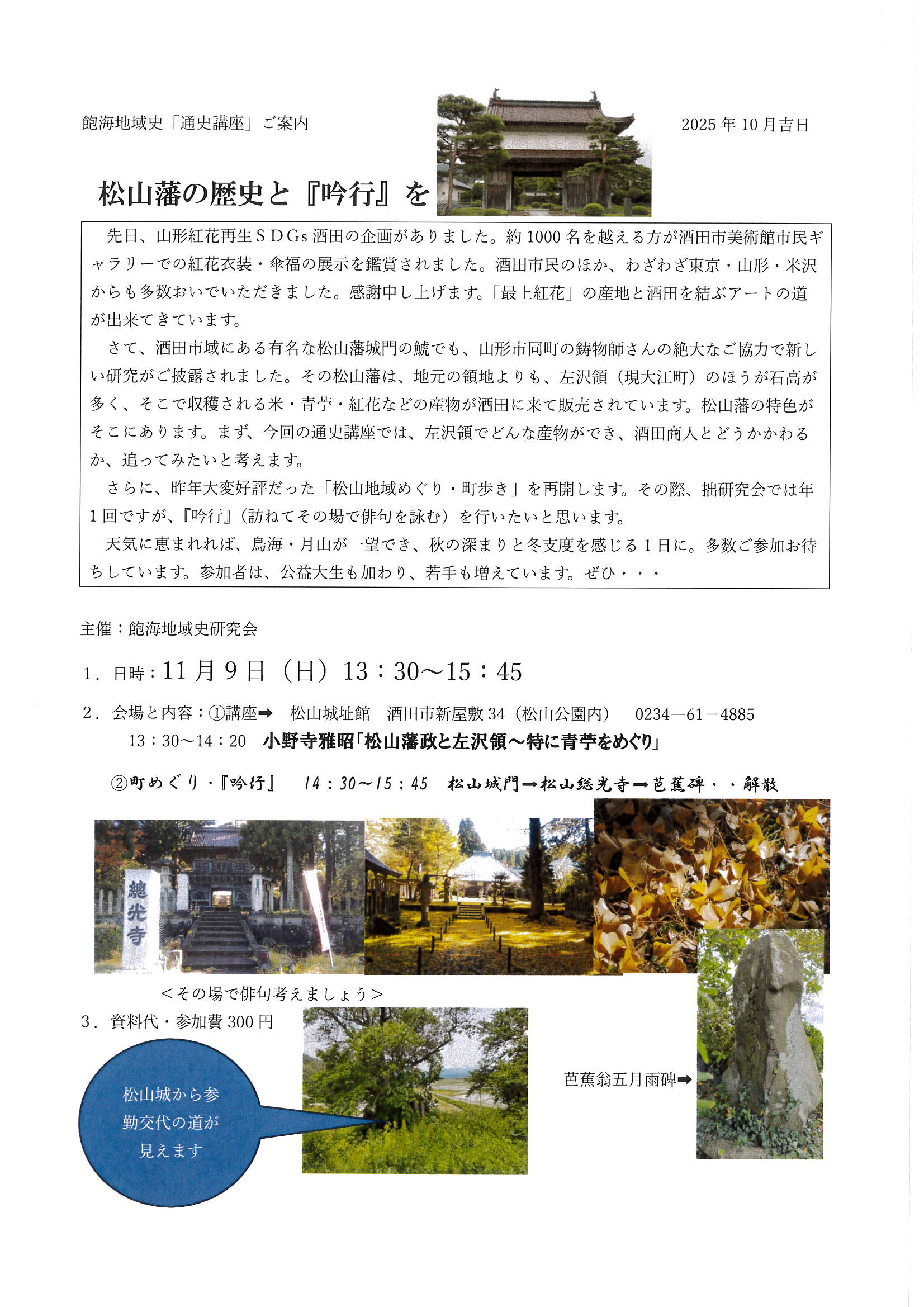11月9日(日)13:30~15:45、松山城址館を会場に飽海地域史研究会主催による通史講座『松山藩の歴史と『吟行』を』が開催されます。
