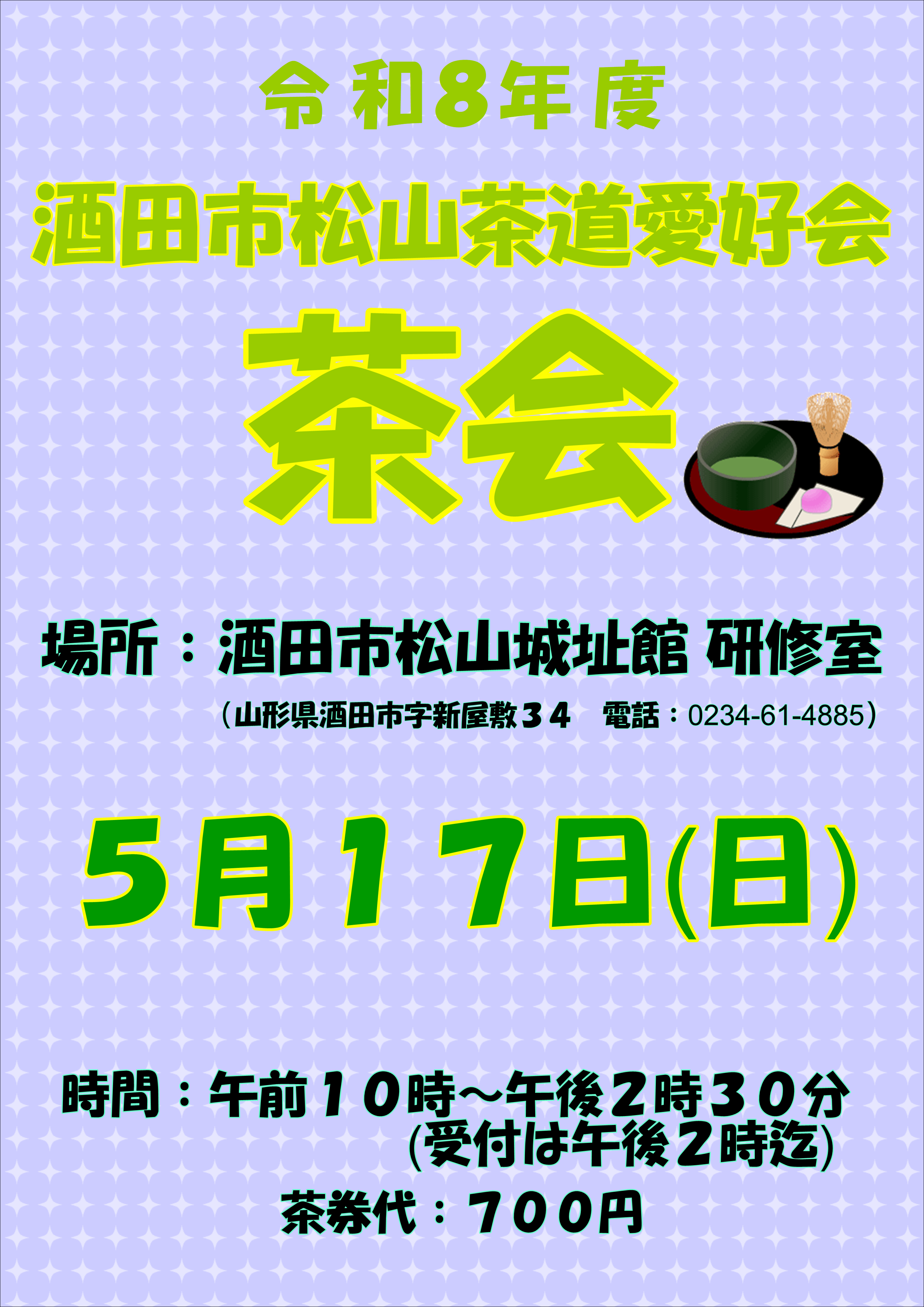 令和8年5月17日(日)松山城址館研修室にて酒田市松山茶道愛好会主催の茶会が開催されます。午前10時~午後2時30分(受付午後2時まで)。茶券代700円。どなた様もどうぞお気軽にお出でください。